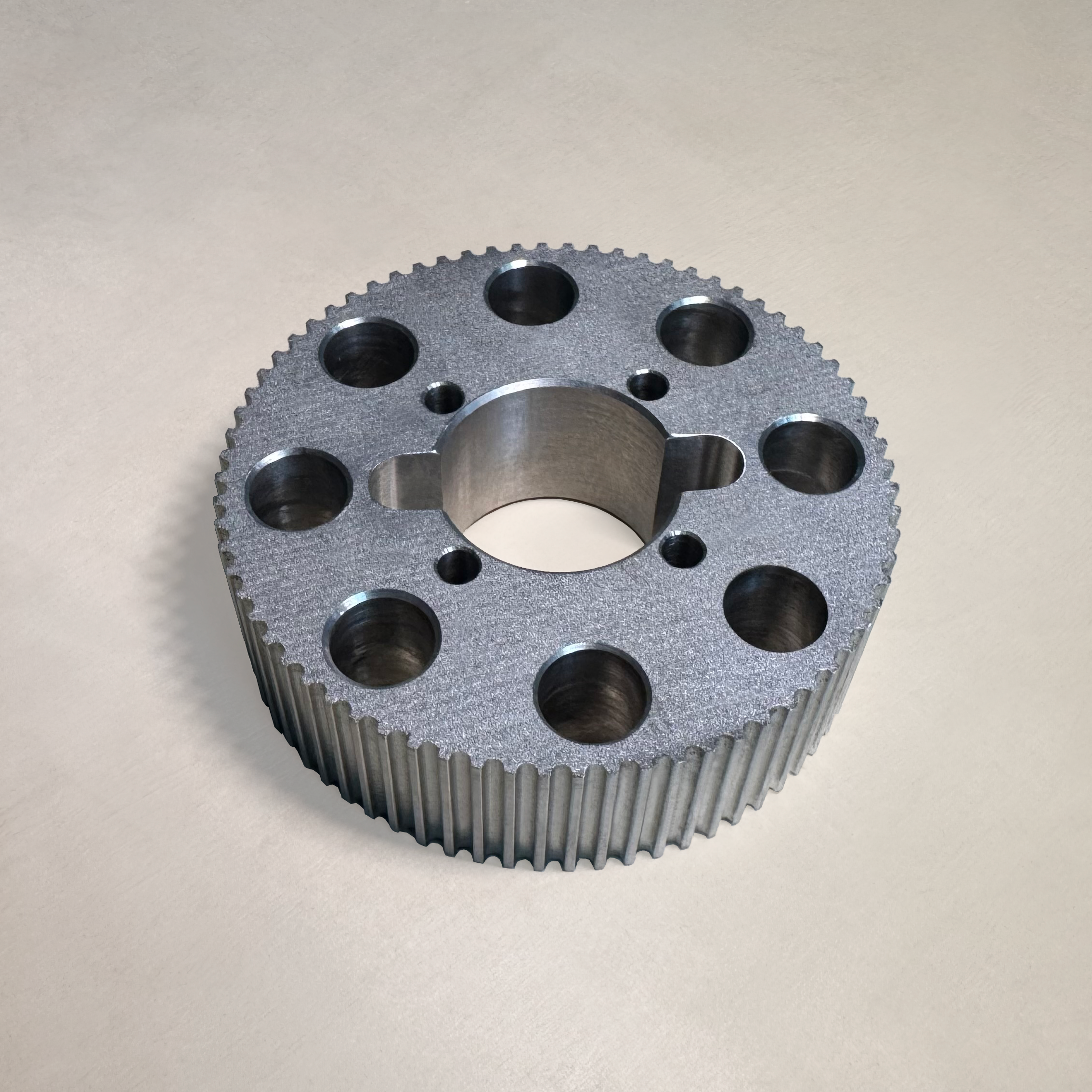 Наши специалисты приняли заказ и приступили к реализации. Шкив изготавливался из металлической заготовки методом токарной, фрезерной и электро-эрозионной обработки. Такой способ производства обеспечивает максимальную точность исполнения, поскольку каждый параметр: диаметр делительной окружности, шаг зубьев, форма профиля, посадочный размер задаётся в соответствии с чертежом заказчика, а не является следствием компромисса с серийным стандартом.